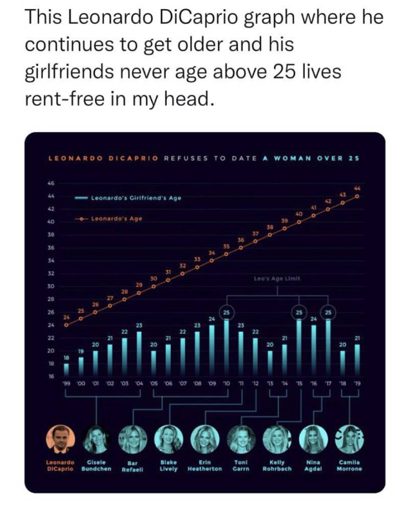 “Have you ever considered that Leonardo DiCaprio is so proud of his work in the Titanic, he only dates women who weren’t old enough to have seen it when it premiered so he can share the special moment of watching it with them for the first time? did that even occur to you,” -Twitter User