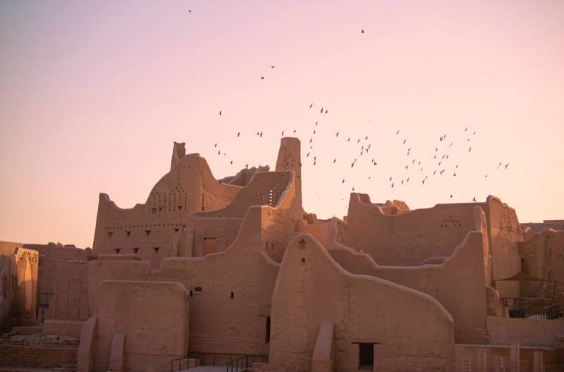 A flock of pigeons fly over the buildings of Salwa Palace in Diriyah in Ar Riyad province, Saudi Arabia.