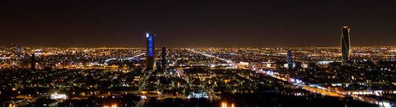 A view of the brightly lit buildings of Riyadh, Saudi Arabia.