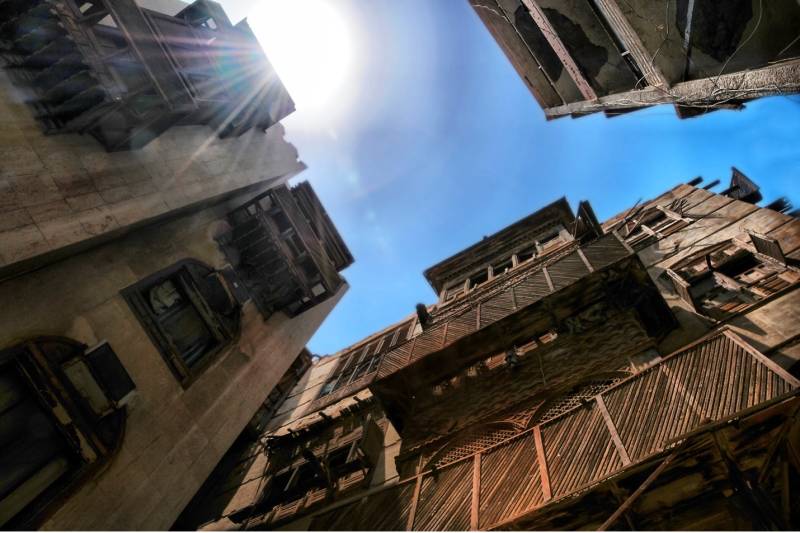 Midday sun shining down on the historic buildings in Al Balad Jeddah, Saudi Arabia.