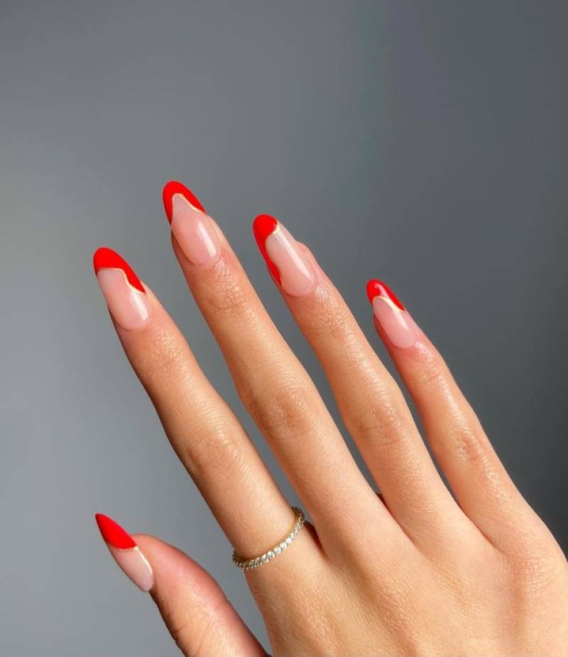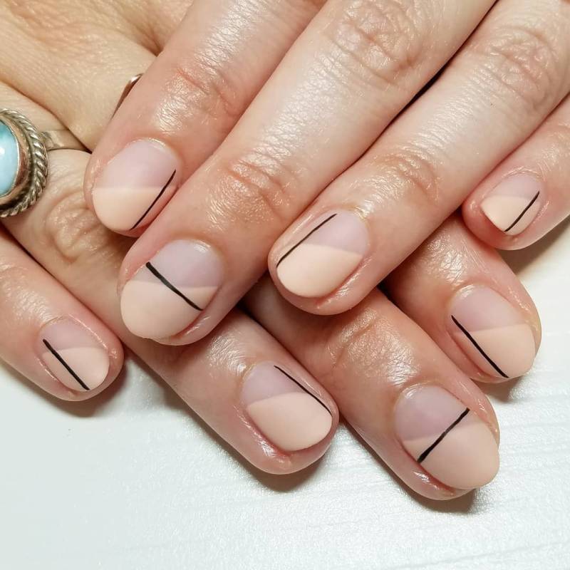 French tips are classic but sometimes we don't always want to settle for classic white; instead, you can change the white tips for different colours and shapes. You can very easily paint your tips in two different colours and paint the strokes in two different lengths to add an abstract look to this classic style.