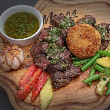 - Steak Gratin- Fillet Mignon Steak topped with buffalo mozzarella, parmesan and cheddar cheese crust with grilled eggplant, grilled apple and rocket leaves on the sides which is served with their chef special scrumptious creamy sauce