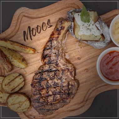- Pan Seared T-Bone Steak: Moocs House Special Pan Seared T-Bone Steak with a side of grilled potatoes and creamy spinach that comes with BBQ sauce.