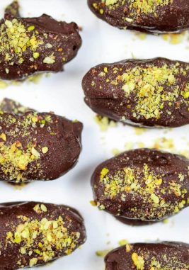 For all the peanut butter and chocolate combo fans out there, you need to try this! Stuff a date with a generous dollop of peanut butter, coat with dark or milk chocolate and add an almond on top.