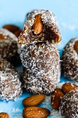 Stuff a date with an almond, dip it into a bowl of melted dark or milk chocolate and then coat it with desiccated/ shredded coconut.