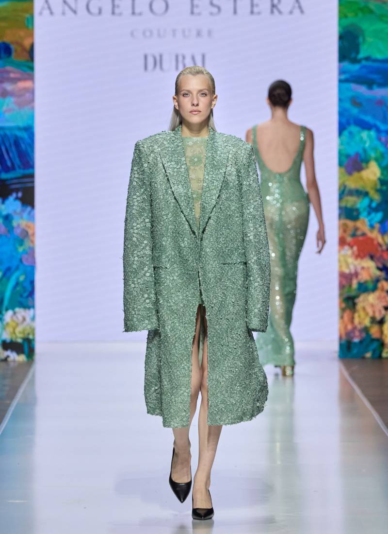 Angelo Estera’s “Elysian Blooms” collection offered an ethereal experience with voluminous skirts, dramatic trains, and mermaid gowns. With brocade fabrics and intricate textures, the UAE-based designer skillfully balanced contemporary silhouettes with timeless elegance, creating pieces that radiated grandeur while remaining versatile across men’s and women’s wear.