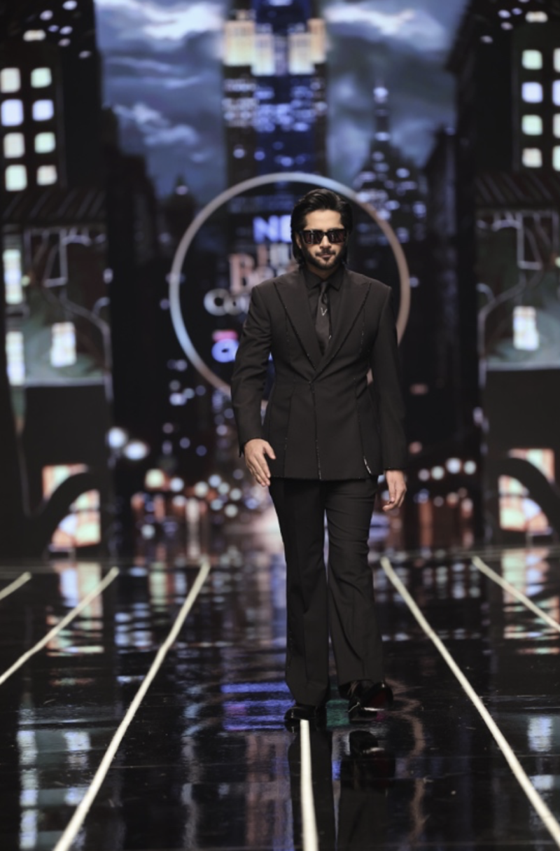 Imran Ashraf Awan, one of the most beloved faces in Pakistani entertainment, took to the runway as the showstopper, embodying the essence of the collection with his effortless style and magnetic presence. Wearing a black velvet jacket adorned with silver accents, paired with tailored trousers and accessories that added a contemporary edge, Awan captivated the audience. His walk was a perfect fusion of confidence and charisma, leaving the crowd in awe and garnering widespread applause.