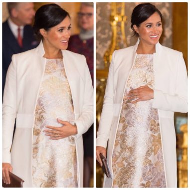 Duke of Sussex Meghan stuns in this cream and gold jacquard brocade dress pairing it with Amanda Wakeley's white coat