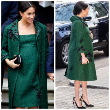 Green Erdem coat (check out the black beaded embellishment) and dress paired with a black box clutch and matching black Aquazzura Deneuve pumps