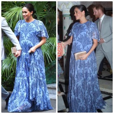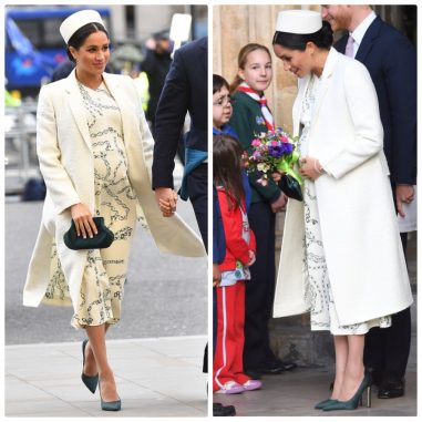 Love the touch of green Meghan has given to this all white outfit. Printed white dress from Victoria Beckham and pillbox hat to complete the look