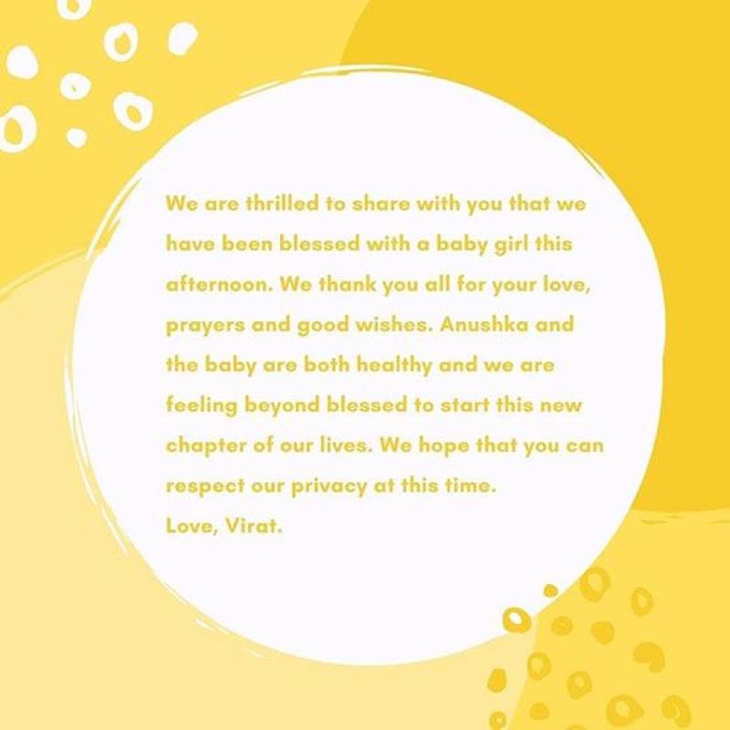 'Anushka and the baby are both healthy, and we are feeling beyond blessed to start this new chapter of our lives. We hope that you can respect our privacy at this time.' Love Virat. Kholi has been supportive of Anushka throughout their pregnancy journey on December 19; he was given maternity leave by the Board of Control for Cricket in India (BCCI). He flew back home from his Australia cricket tour to be with his wife and has been by the side of his wife since then.