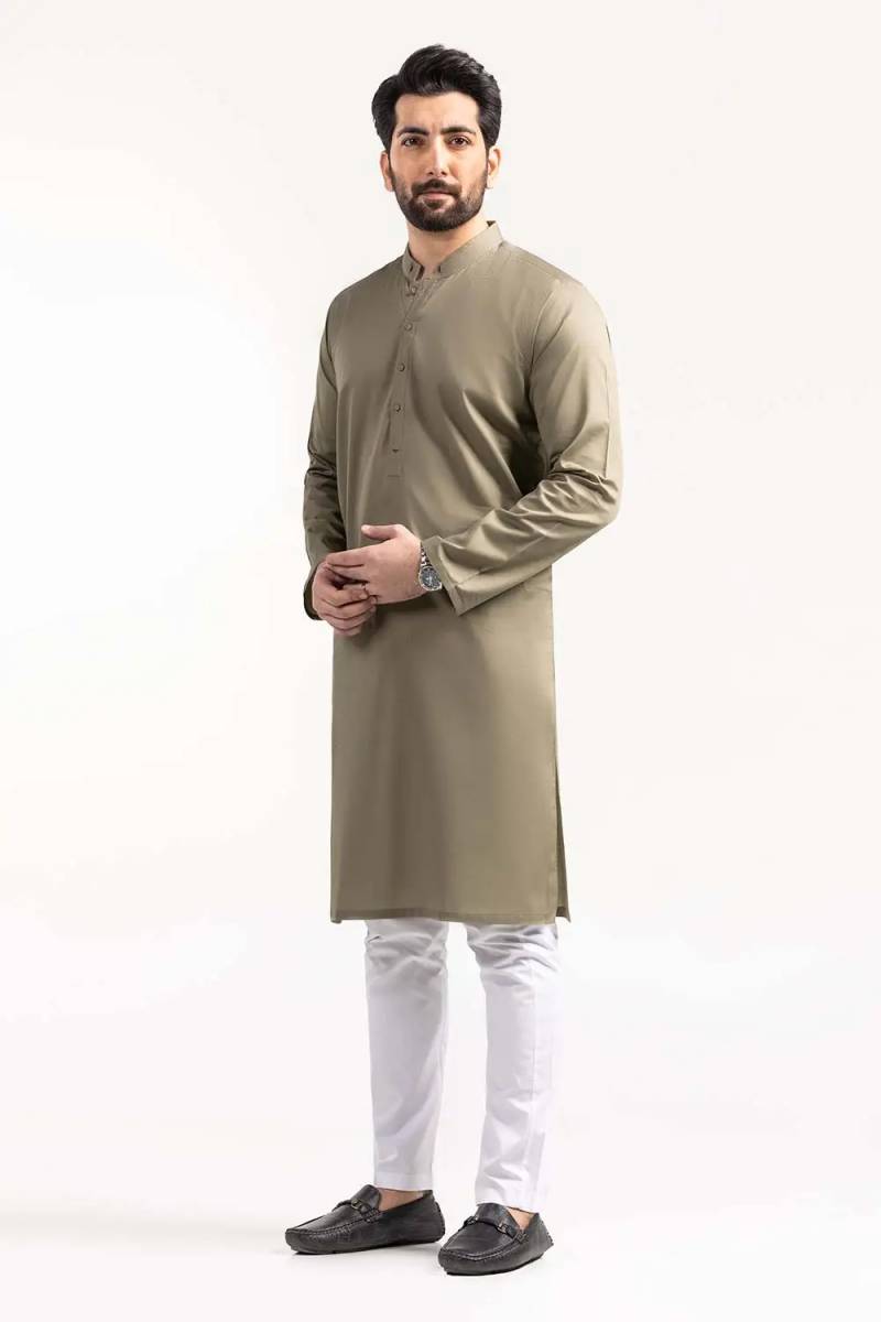Olive green is definitely trending nowadays in men’s fashion. This kurta has a very minimalistic but exclusive look to it. Those who dig simple yet chic kurtas for their day to day wear, this one is for you. The kurta has a very elegant embroidery on the collar with a neat finishing that will appeal all the people who search for delicate designs.