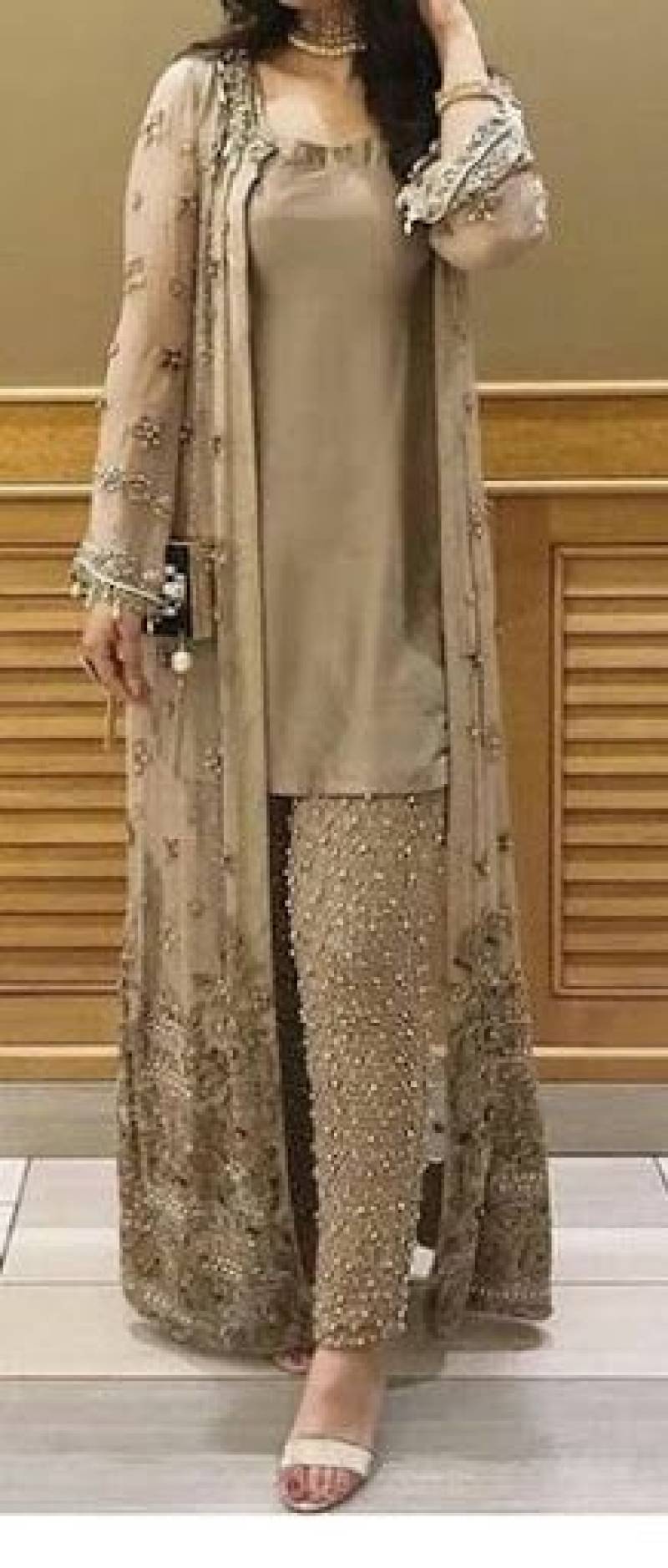 Instead of wearing fully embroidered and heavy looks, it's better to opt for a plain one-color kurta and cigarette pant set as a base, paired with a matching embroidered or beaded open jacket. This look is comfortable, mobile, and easy to put together. This look will not only keep you comfortable but is also trendy and flattering on many body types.