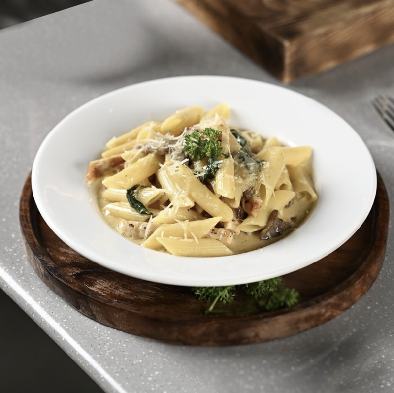 • Roasted Garlic and Mushroom Penne: Rich and creamy, with a base of parmesan sauce, roasted garlic, mushrooms, spinach, and grilled chicken.
