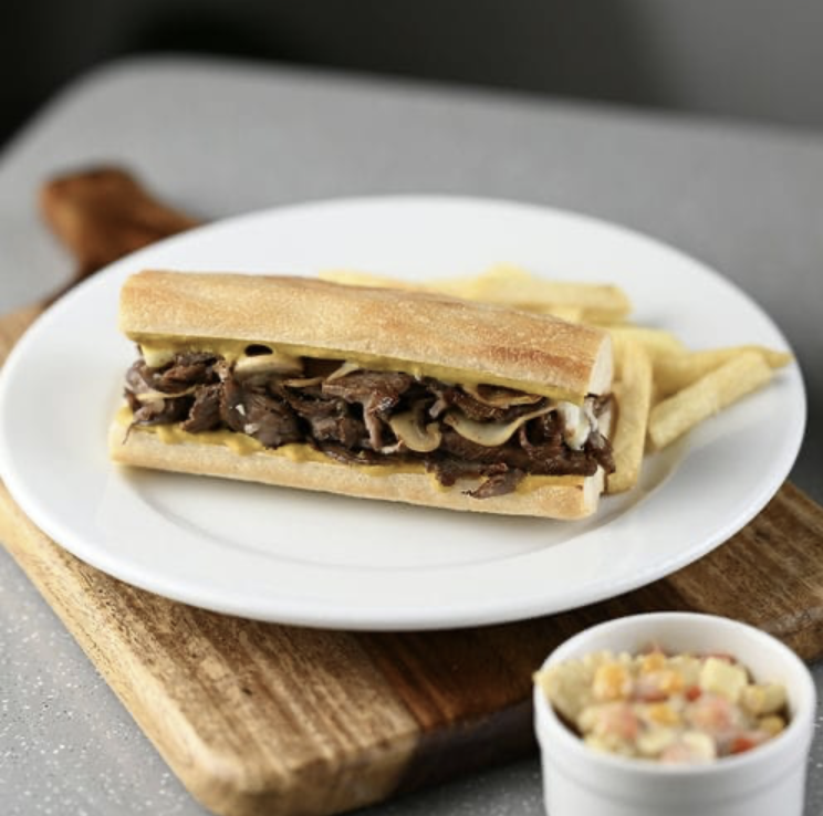 • Steak and Mushroom Sandwich: Sliced beef tenderloin, sautéed mushrooms, and buffalo mozzarella served on a warm Italian roll with pasta salad and fries.