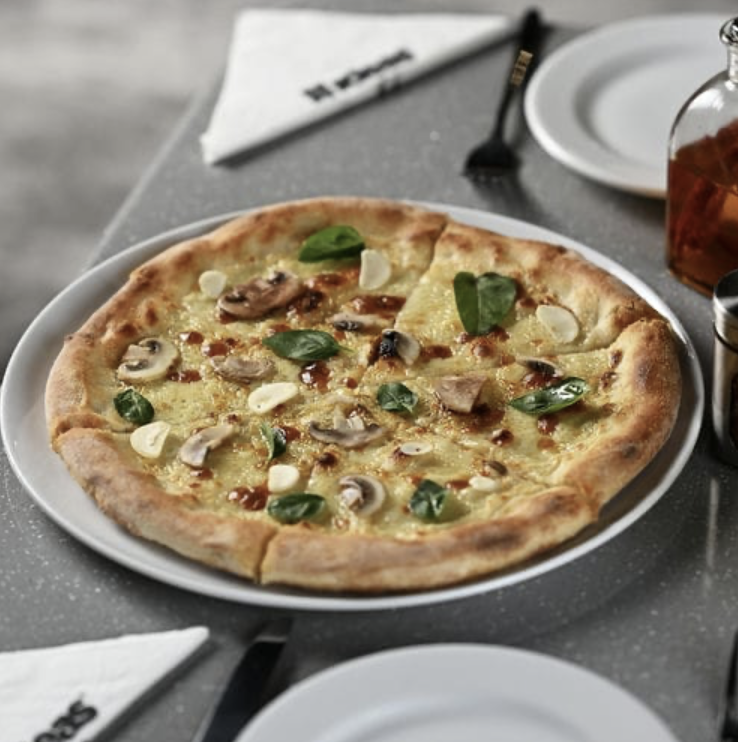 • Mushroom Bianca: A creamy white pizza elevated by buffalo mozzarella, parmesan cream, basil, and a generous topping of mushrooms and garlic.