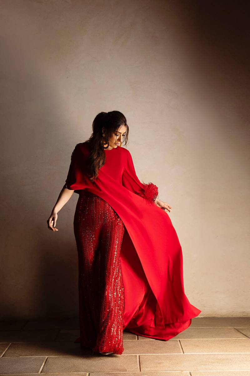 As for HELLO’s shoot, Mehwish is effusive about Rashmi Kumari’s designs: “Every piece felt powerful — a blend of strength and softness, bold but still rooted in tradition.” Her favourite? “The deep burgundy ensemble with structured shoulders and metallic accents. Regal and commanding — something you'd wear when you know exactly who you are and have nothing to prove.”