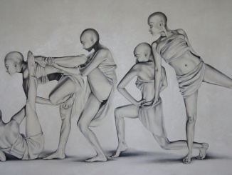 She derives her inspiration essentially from a variation of dance and theatre technique translating that into a comprehensive observation of human behavior. Including body posture movements and portions of anatomy, the artist delves into a world of contrast and harmony and forms it with her own perceptions. Her work primarily involves studying different human surfaces such as skin, bone, including daily facades transforming the mundane into spectacular, prefers to incorporate extremes of two aspects such as the climax between black and white. Her paintings depict a symmetry of animate and inanimate describing the relationship between the two, exploring different factors and highlighting the contrast as the artist firmly believes that there is no vice without virtue.