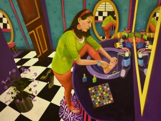 A visual artist and writer who is based in Lahore. Her work is a focus of portraying female figures which play a strong role (protagonist) in her storytelling experience. The paintings have an eerie and melancholic vibe but the narrations are anything but morbid rather thought provoking and highly perceptive. She feels prompted to view medieval religious iconography, the unintended humor in many medieval paintings are suited to expressing the ennui that seems to define the lives of the girls around her. The medieval paintings add grandeur to routine acts also alluding the domestic apotheosis.