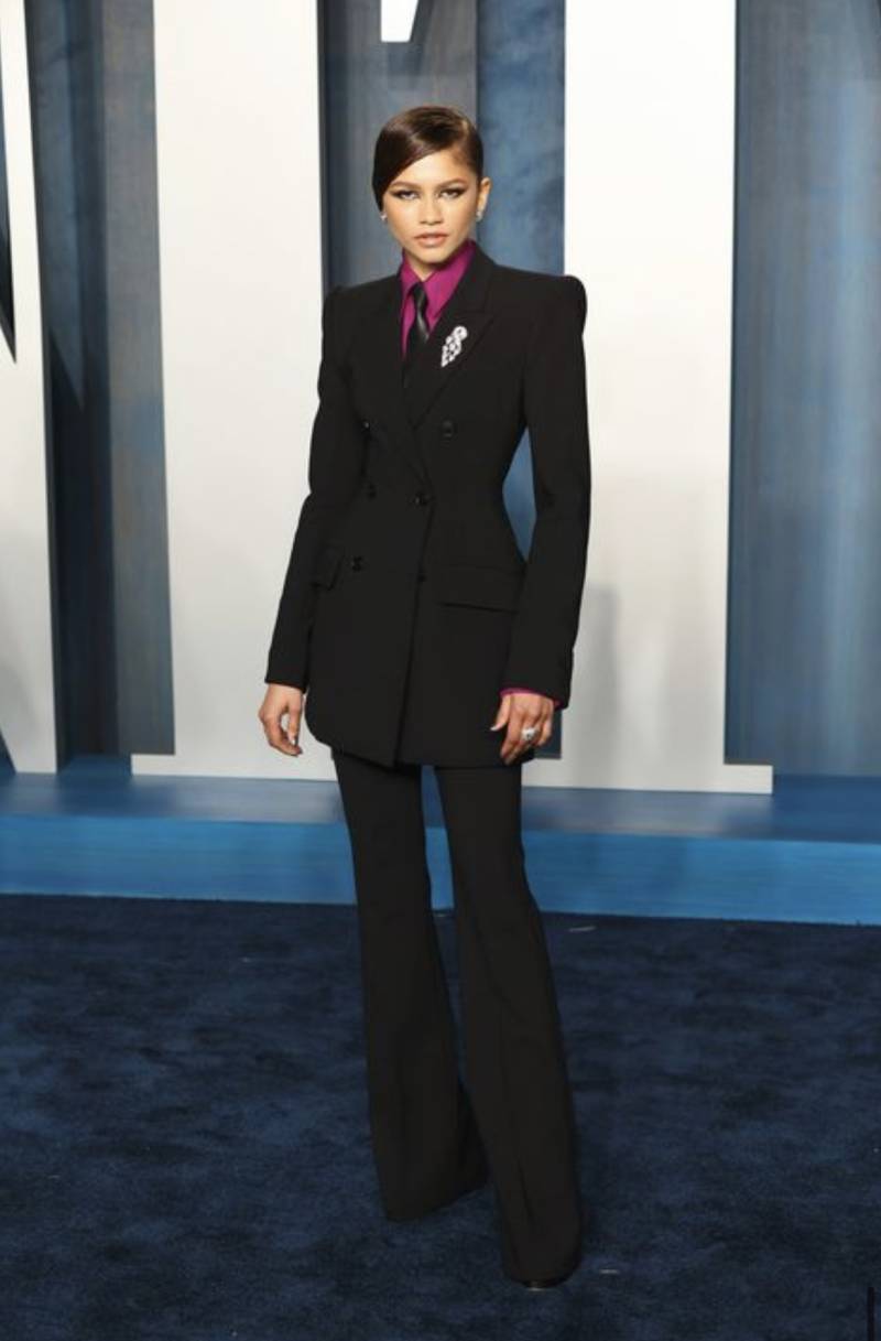 Zendaya walked the red carpet in a Sportmax hourglass suit with a bright purple shirt. She added a pop of shine to her silver jewellery and brooch. her satin tie and glossy lips only accentuated her look. This look and Zendaya's shining confidence made us want more.