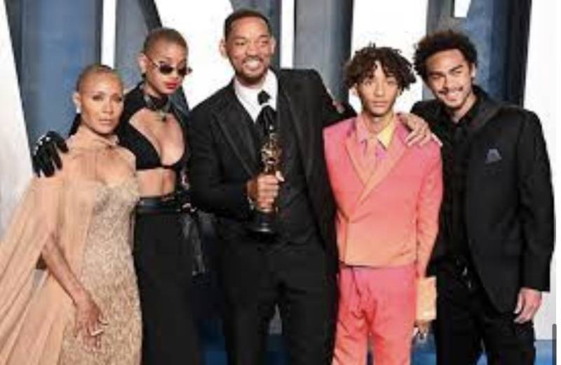 The Smith family walked in as one showing off their own styles while celebrating their father Will Smith's Oscar win. Jada Pinket Smith rocked an elegant floor-length gown while Jaden Smith stood out in his bright-colored suit and willow Smith chose a more grunge look.