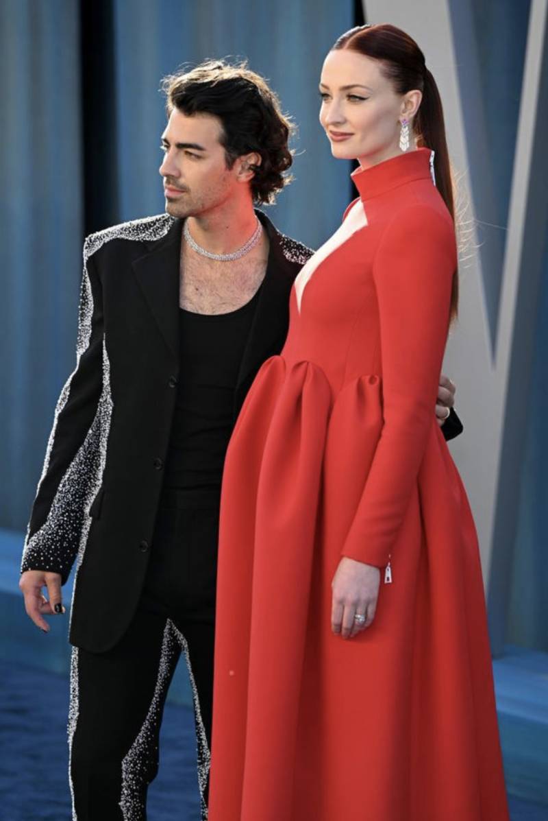 Sophie turner walked in with her husband in a red full-length Louie Vuitton gown that highlighted her beautiful baby bump. Paired with minimal jewellery and minimal hair and makeup. Joe Jonas complemented her well in his graphic suit with hints of glitter paired well with his curly hair and diamond necklace.