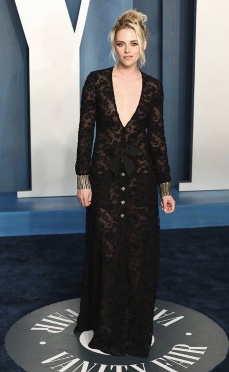 The simple answer is she can do everything. Dawning yet another Chanel look but now a floor-length sheer lace gown. This was a complete opposite look from her hot pants suit at the Oscar. Her versatility is off the charts. Pairing the elegant gown with tousled hair she has a perfect look that only she can pull off.